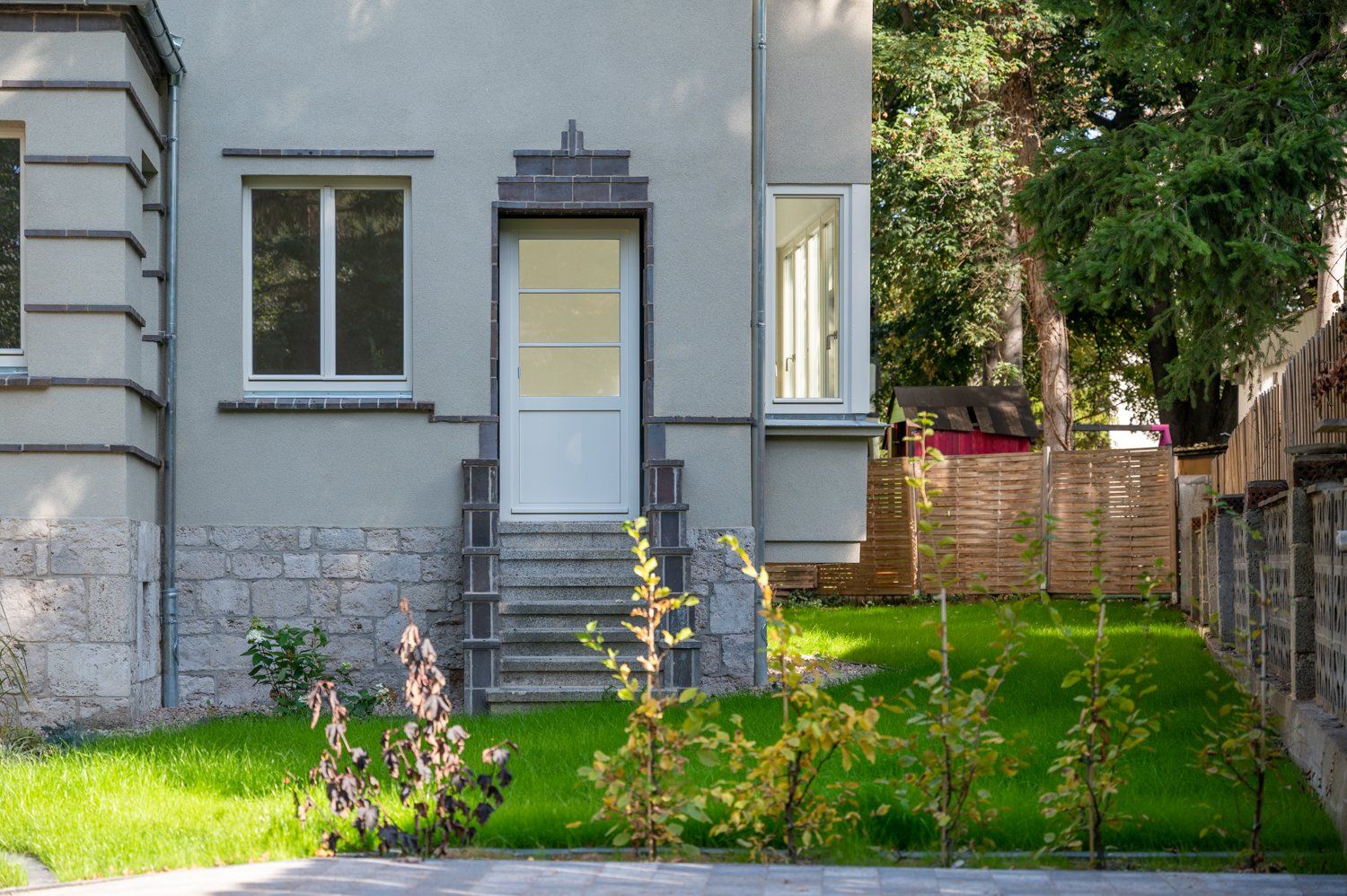 Auch die Außenanlagen des Wohnhauses wurden beim Umbau nicht vergessen. Am Gebäude befindet sich nun eine kleine Grünfläche inklusive einer neu gestalteten Blumenrabatte.