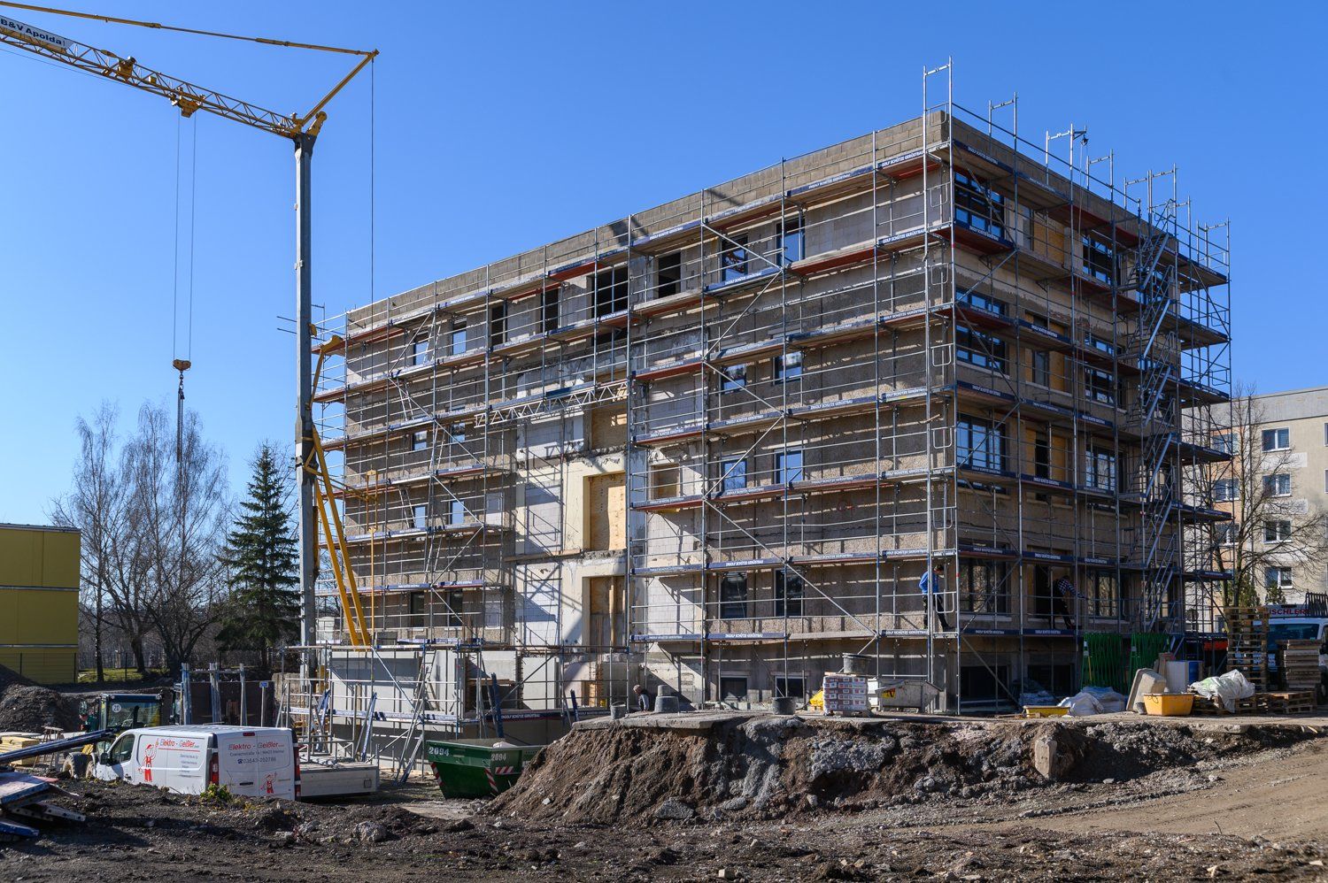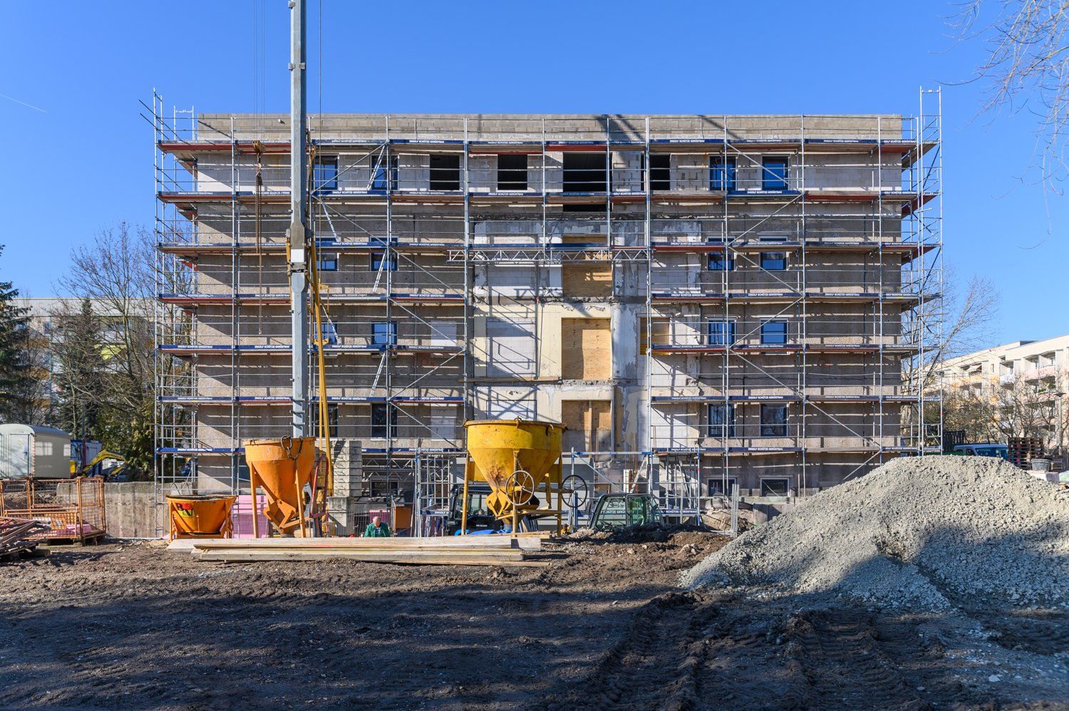 Parallel zu den Baumaßnahmen laufen im Außenbereich die Rohbaumaßnahmen für das zukünftige Treppenhaus samt Aufzug. Diese sollen in den kommenden Wochen beendet werden.