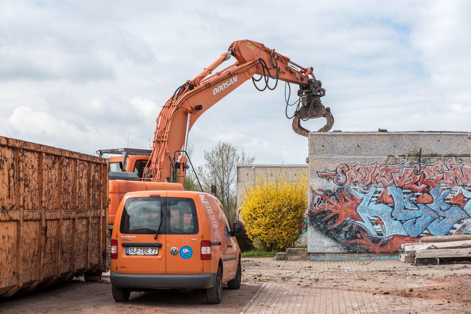 Seit Mitte April laufen die Abrissarbeiten der Sporthalle auf dem Gelände der Berufsschule „Friedrich Justin Bertuch“ in Schöndorf. Zwei Bagger tragen die verschiedenen Baustoffe ab. Diese werden dann getrennt und fachgerecht entsorgt. Nach Beendigung der Abbrucharbeiten erfolgen die Vorbereitung des Baugrundes und der Aushub der Baugrube für den Neubau der Zweifeldhalle. Die Zweifeldhalle wird zur Hälfte in den Hang hinein gebaut.