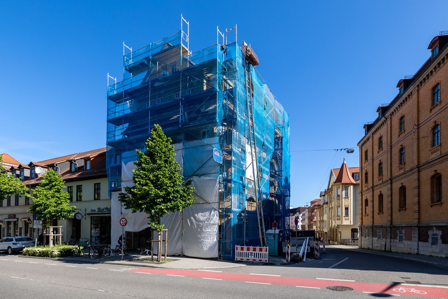 Die Sanierungsarbeiten in der Schützengasse 16 sind weithin sichtbar, denn das komplette Gebäude ist eingerüstet.
