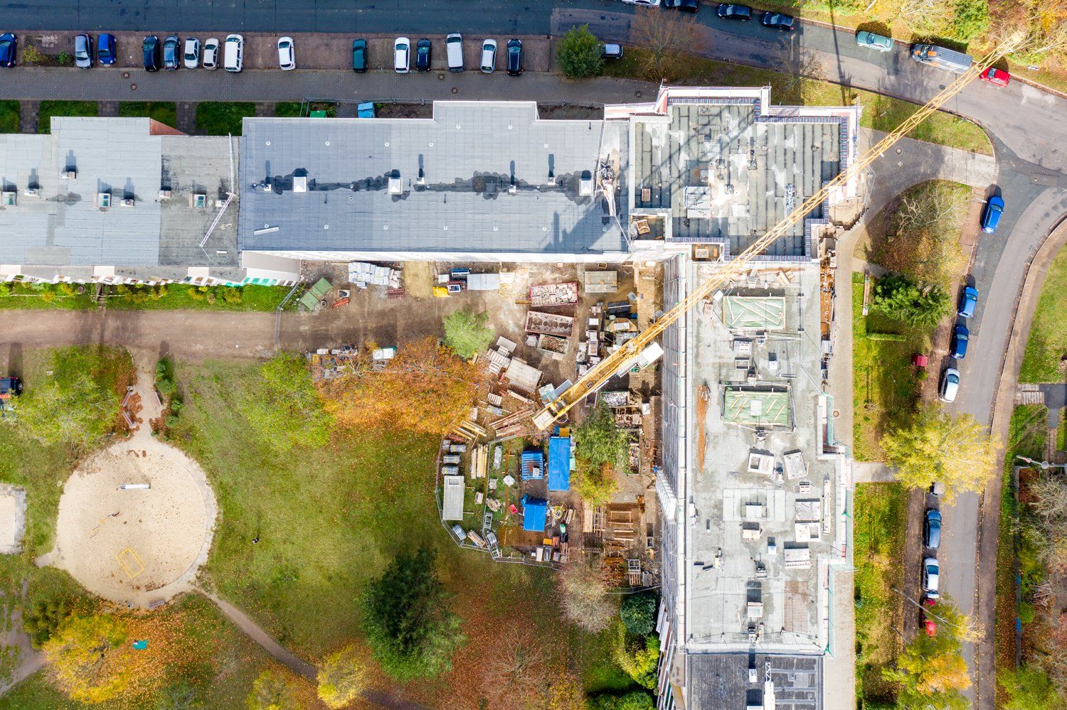 Die Arbeiten am Sanierungs- und Erweiterungsneubau in der Moskauer Straße 126 gehen mit großen Schritten voran und Anfang Oktober konnte das Richtfest mit vielen Gästen und Besuchern gefeiert werden. Mit der Fertigstellung des Rohbaus begannen die Baumaßnahmen im Inneren. Neben Trockenbauarbeiten sowie Heizungs- und Sanitärinstallationen wurden in den vergangenen Wochen die neuen Fenster und Balkontüren eingesetzt, um so eine wetterunabhängige Baugrundlage für den Innenausbau zu schaffen. Aber auch die Fassade hat sich inzwischen sichtlich verändert. Große Teile des Gebäudes wurden nach energetischen Standards gedämmt und verputzt. Die restlich verbleibenden Dämm- und Putzarbeiten werden – je nach Wetterlage – noch in diesem Jahr beendet. Alle Gewerke liegen gut im Zeitplan, bis zur Fertigstellung Ende 2020 gibt aber noch jede Menge zu tun. Fotos: Johannes Krey | JKFotografie & TV