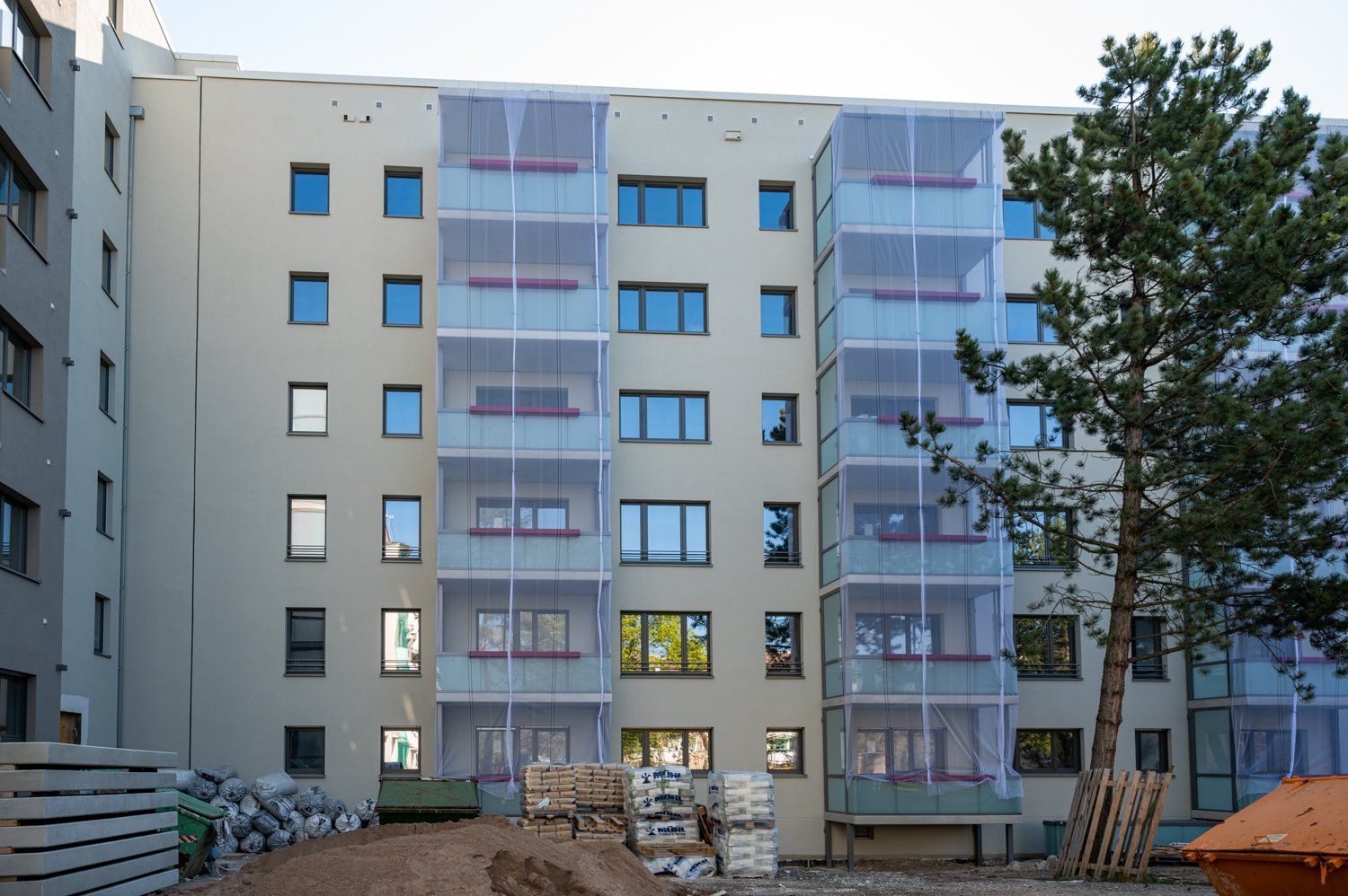 Trotz der aktuellen Einschränkungen durch die Corona-Maßnahmen liegen die Arbeiten in der Moskauer Straße 126 gut im Zeitplan. In den vergangenen Wochen wurde die Fassade des Gebäudes fertiggestellt und die neuen Balkone installiert. Und nach Abschluss dieser Arbeiten war es so weit – das Gerüst wurde entfernt. Im Gebäudeinneren liegen die Ausbauarbeiten ebenfalls gut im Zeitplan. Der Trockenbau ist auf allen Etagen nahezu fertiggestellt. Aktuell wird an den Heizungs- und Sanitärinstallationen gearbeitet und Wände werden gespachtelt und verputzt. Sobald diese Arbeiten abgeschlossen sind, können die neuen Fußbodenbeläge in den Wohnungen verlegt werden. Parallel zu den Innenarbeiten beginnen in den kommenden Wochen auch die Umgestaltungsarbeiten im Außenbereich. Unter anderem soll der barrierefreie Eingangsbereich fertiggestellt und im Innenhof eine Sammelstelle für Müllcontainer angelegt werden. Fotos: Johannes Krey | JKFotografie & TV