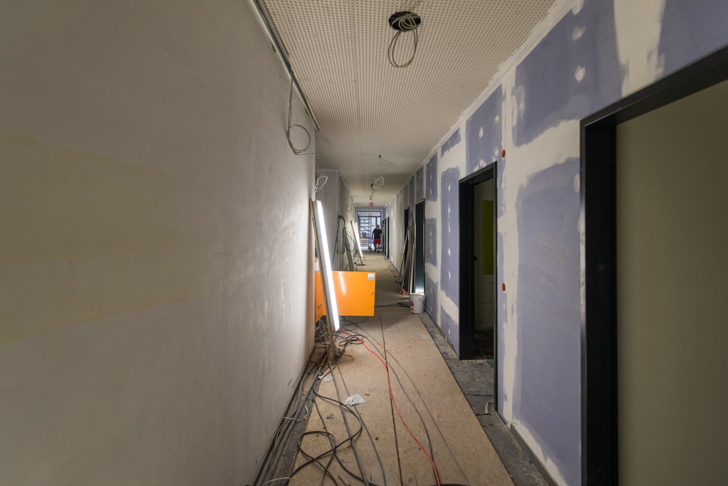 Maler und Fliesenleger arbeiten mit Hochdruck im Sozialtrakt, um auch hier die im Zeitplan liegenden Arbeiten abzuschließen.