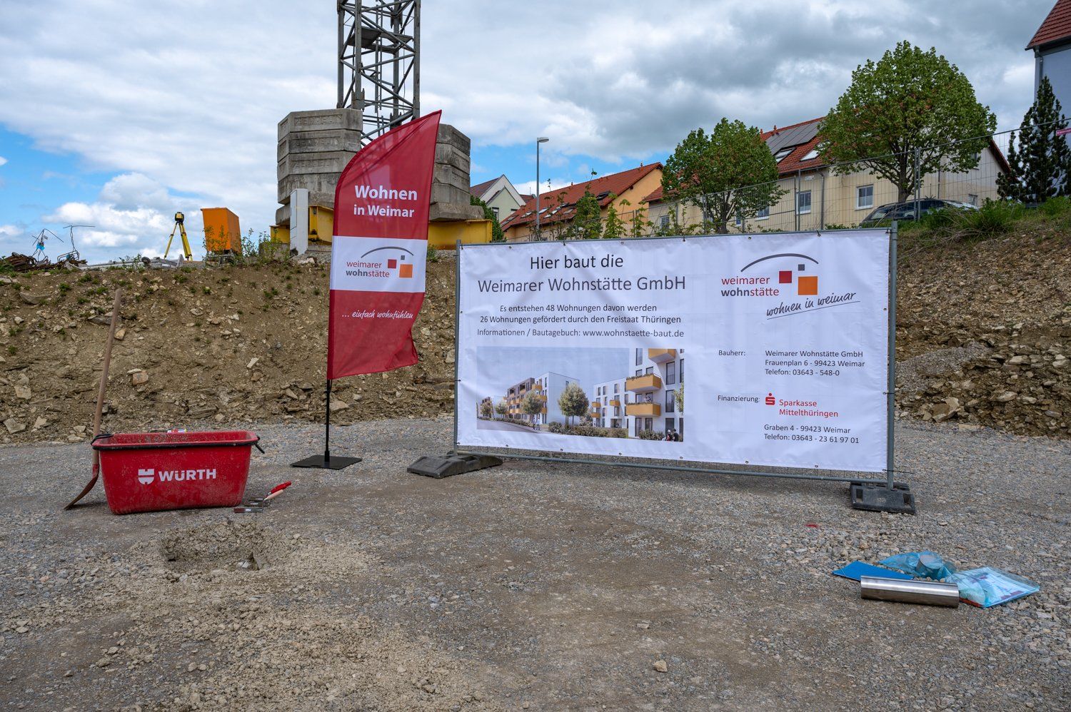 Zum anderen… war dies aufgrund der Einschränkungen durch die Coronakrise mit A B S T A N D der kleinste Teilnehmerkreis bei solch einem traditionellen Anlass in der „Baugeschichte“ der Weimarer Wohnstätte. In Anwesenheit von Herrn Peter Kleine – Oberbürgermeister der Stadt Weimar und Aufsichtsratsvorsitzender der Wohnstätte, Frau Yvonne Samland als Vertreterin der Thüringer Aufbaubank, Herrn Harry Wunder, Geschäftsführer der WBB Bau & Beton GmbH sowie Vertretern der lokalen Presse wurde die Zeitkapsel in die Bodenplatte eines der Gebäude eingelassen.