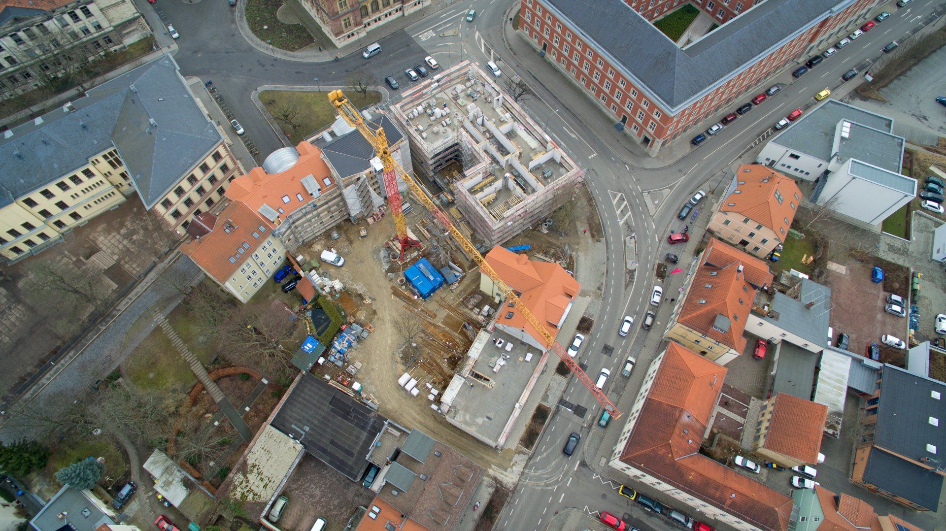 Mit einem Multikopter haben wir die Baustelle des Wohnpalais am Rathenauplatz 1 aus der Luft aufnehmen lassen. Hierbei stand die besondere Perspektive aus der Luft im Fokus. Mit einem Multikopter können Luftbildaufnahmen in einer Höhe von bis zu 100 Metern angefertig werden. Hierbei gelten jedoch spezielle Voraussetzungen, welche durch das Thüringer Landesverwaltungsamt geregelt sind.