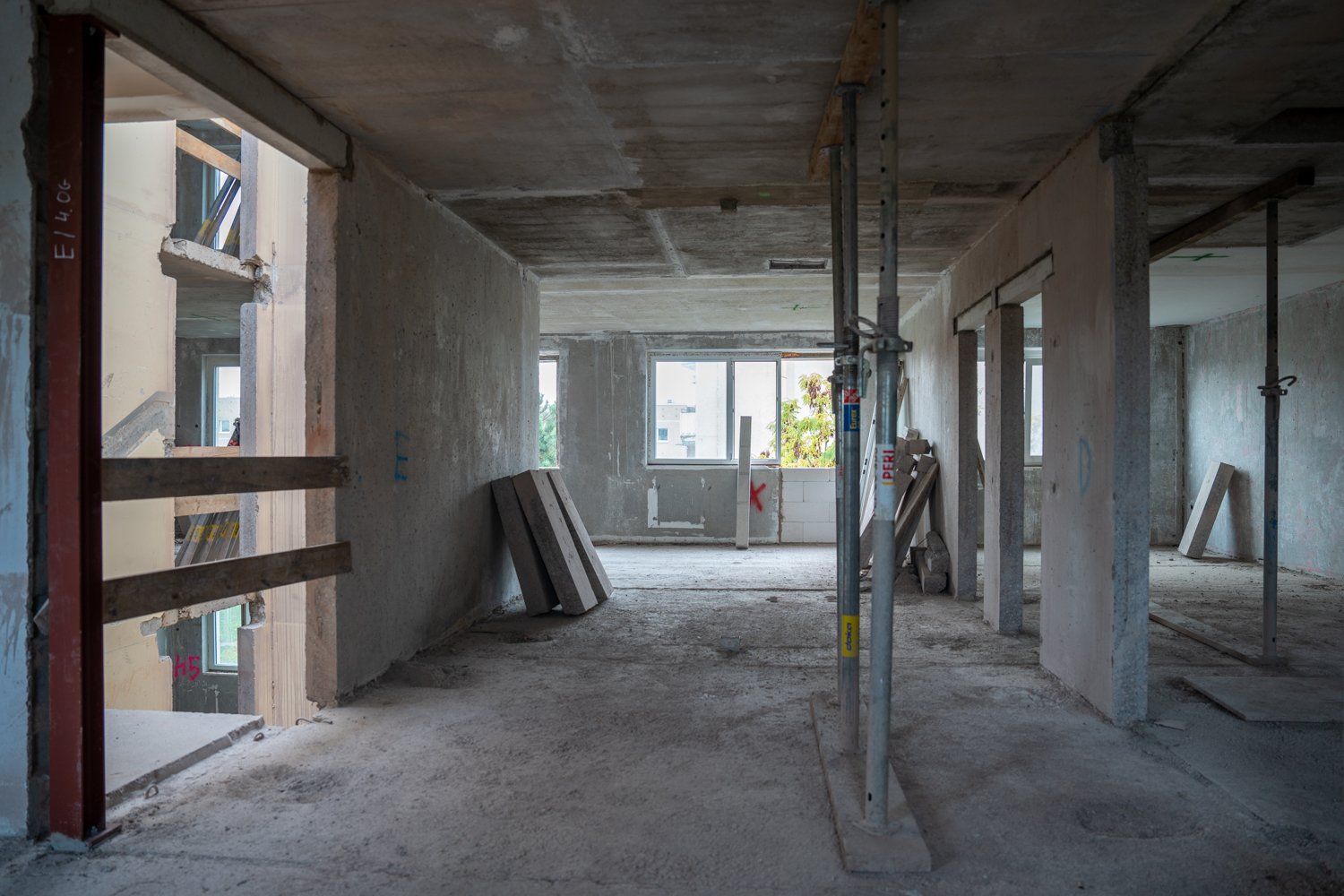 Nach der kompletten Entkernung des Gebäudes mit Rückbau aller nichttragenden Innenwände, Ausbau der Badzellen und des Estrichs sowie dem Rückbau der Balkone sind nun die Rohbauarbeiten in vollem Gange. Neben Gründungs- und Abdichtungsarbeiten im Außenbereich wurde nun auch das imposante Eingangsbauwerk fertig gestellt. Im Inneren des Gebäudes wurden Türöffnungen in bestehende Betonwände geschnitten, Treppen entfernt und neue Decken sowie der erste Aufzugsschacht eingebaut. Im vorderen Gebäudeteil beginnt der Innenausbau mit den Gewerken Trockenbau, Haustechnik und Putzarbeiten. Zudem wurde bereits ein großer Teil der Fenster eingebaut, welche neuesten energetischen Anforderungen entsprechen. In den nächsten Wochen beginnen regionale Unternehmen mit der Montage des Wärmedämmverbundsystems und der Sanierung des Daches.