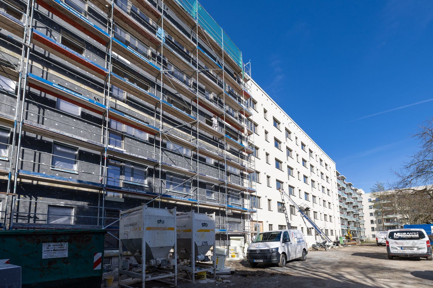 Die Umbau- und Sanierungsmaßnahmen im Objekt Moskauer Straße 45 gehen gut voran. Die Arbeiten des ersten Bauabschnitts befinden sich auf der Zielgeraden. Nachdem der Trockenbau fertiggestellt, die Bäder gefliest und mit neuer Sanitäreinrichtung versehen wurden, steht die Verlegung eines hochwertigen Vinylbodenbelags an. Zudem werden die neuen Balkone angebracht und der Aufzug installiert. Mit diesem können die künftigen Bewohner alle Etagen barrierefrei erreichen. Voraussichtlich ab dem Sommer sind die Wohnungen des ersten Bauabschnitts bezugsfertig. Im zweiten Bauabschnitt liegen die Sanierungsarbeiten ebenfalls gut im Zeitplan. Hier laufen jetzt die Trockenbauarbeiten in den neuen Wohnungen auf Hochtouren. Ziel ist es, diesen Bauabschnitt bis zum Jahresende fertigzustellen.