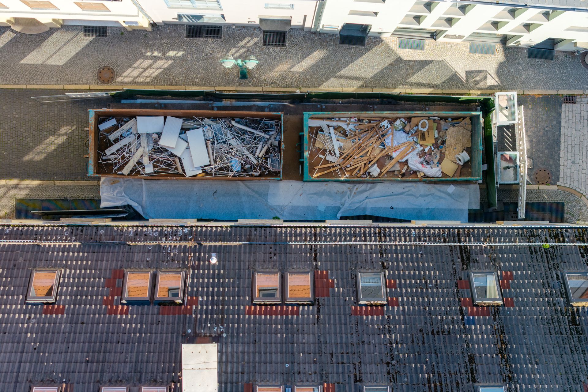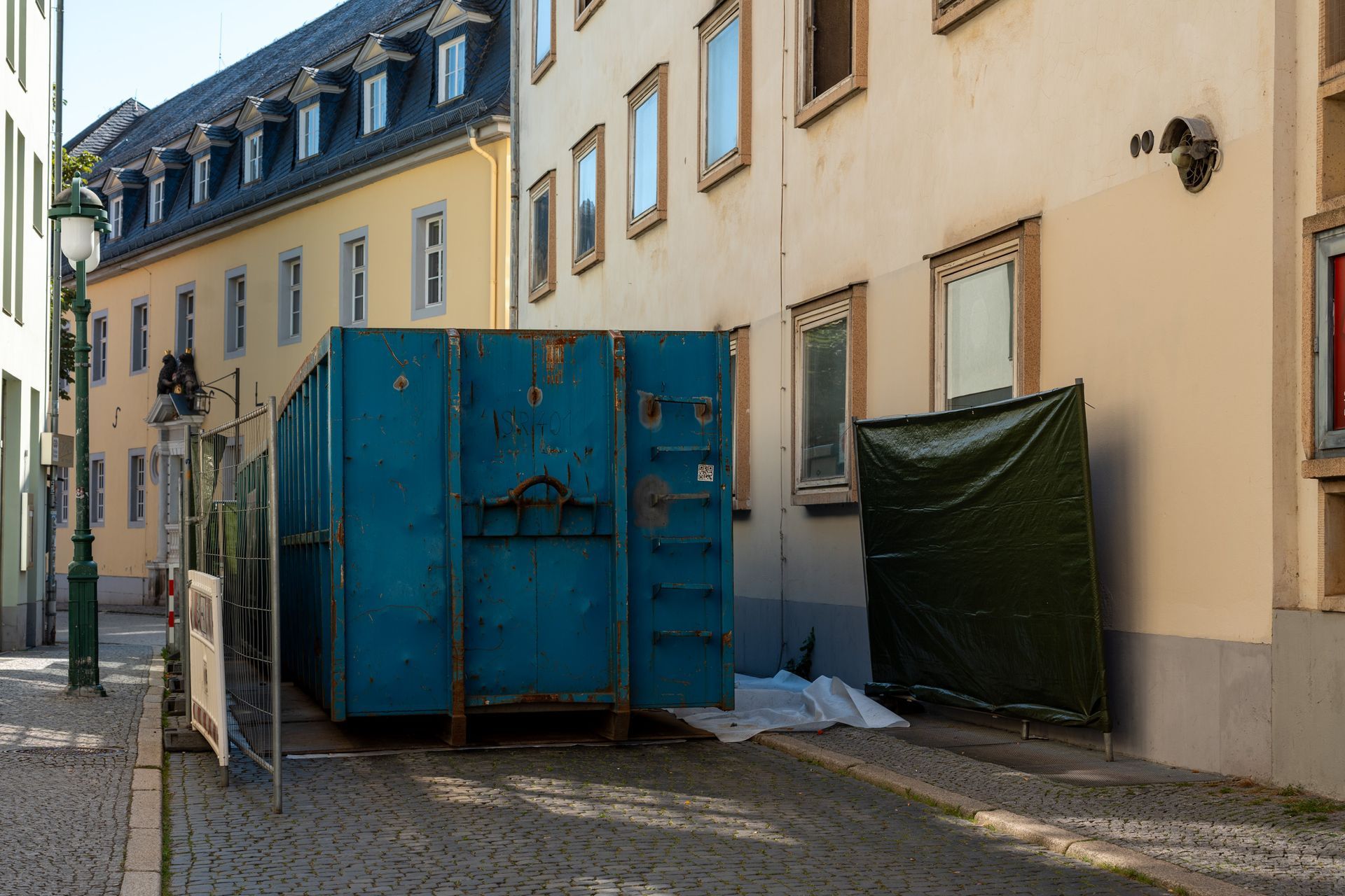 Alle Abbruchmaterialien werden sortengerecht von den Arbeitern getrennt. Um die dafür notwendigen Entsorgungs Container aufzustellen, mussten rund um das Gebäude Absperrungen errichtet werden.