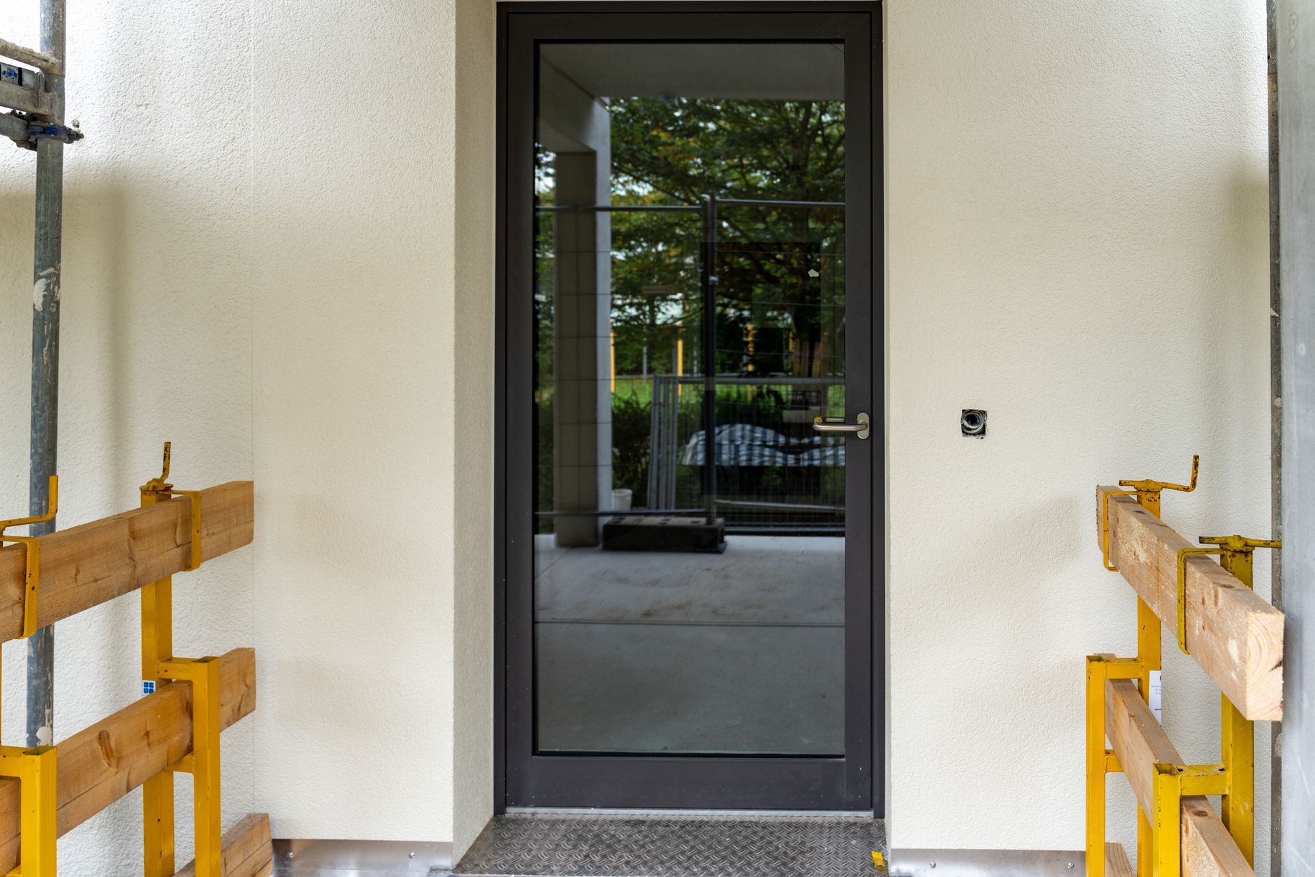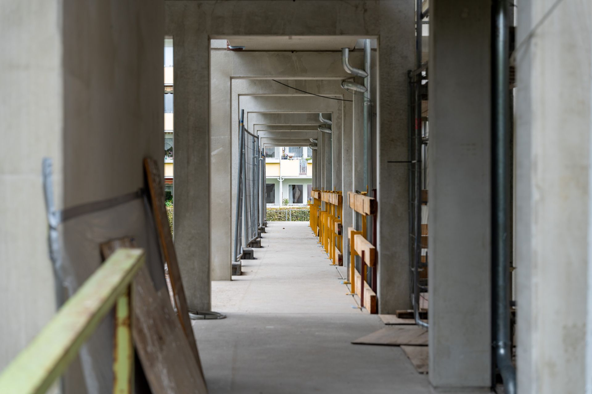 Im Zuge der Bauarbeiten wurden auch die Eingangstüren der Bestandsgebäude an der Bonhoefferstraße erneuert und entsprechen jetzt dem neuesten Standard. Der Rohbau des Laubengangs ist abgeschlossen, und die neuen Treppen sowie Auffahrtsrampen wurden gepflastert. In den kommenden Wochen werden die Absturzsicherungen und Handläufe installiert.