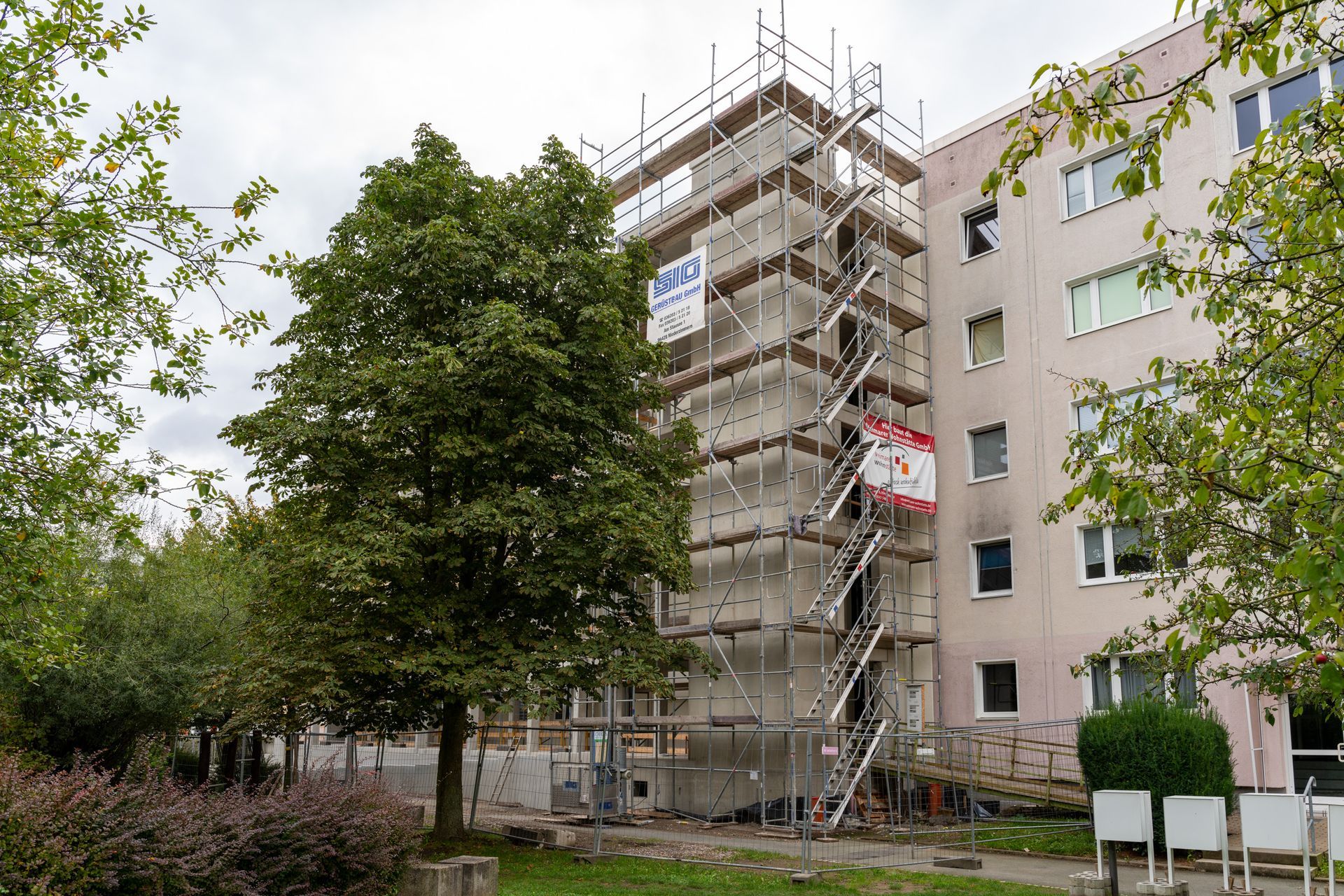 Da während der Rohbauarbeiten das Gebäude eingerüstet werden musste, wurde diese Gelegenheit genutzt, um die Fassade neu zu streichen.