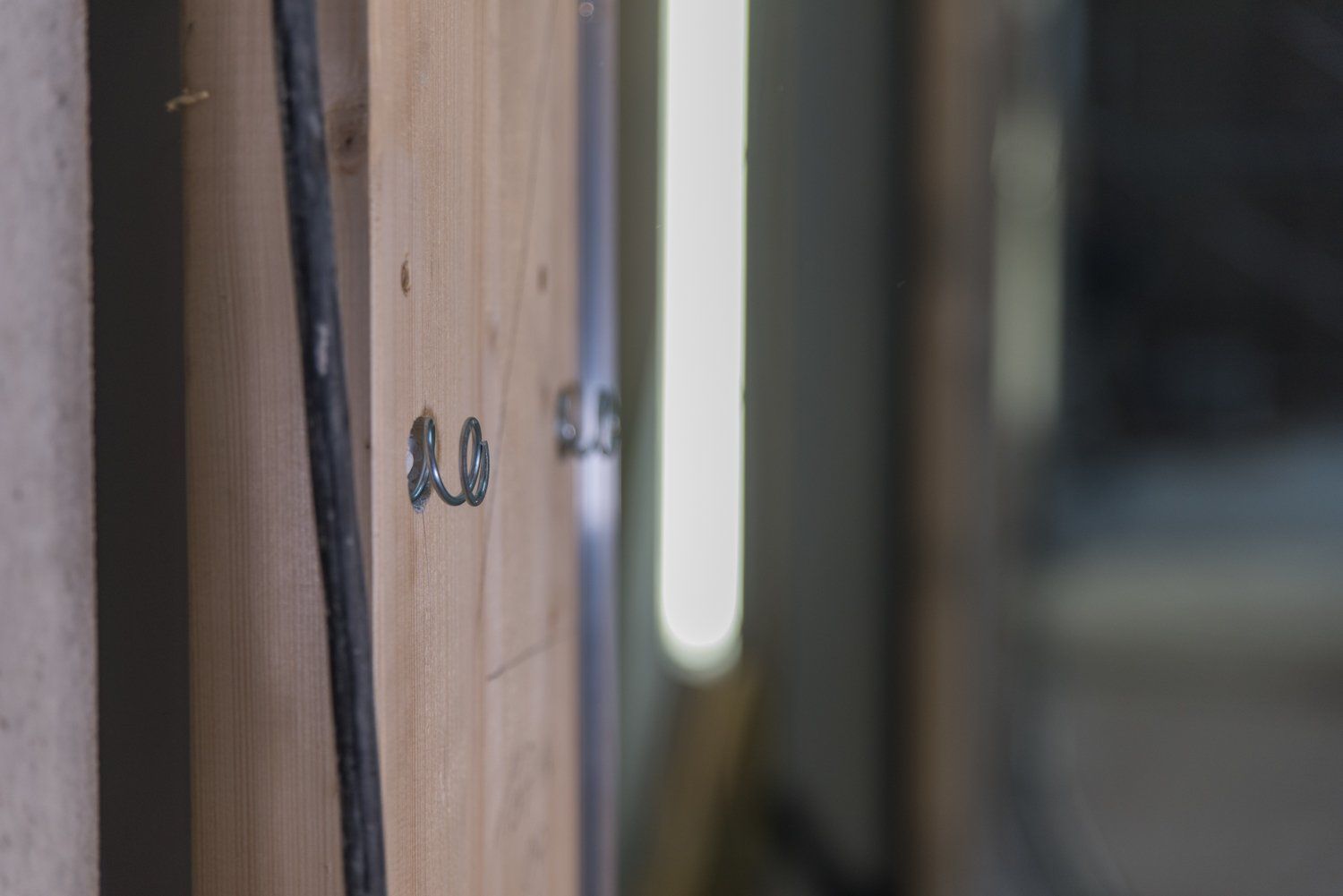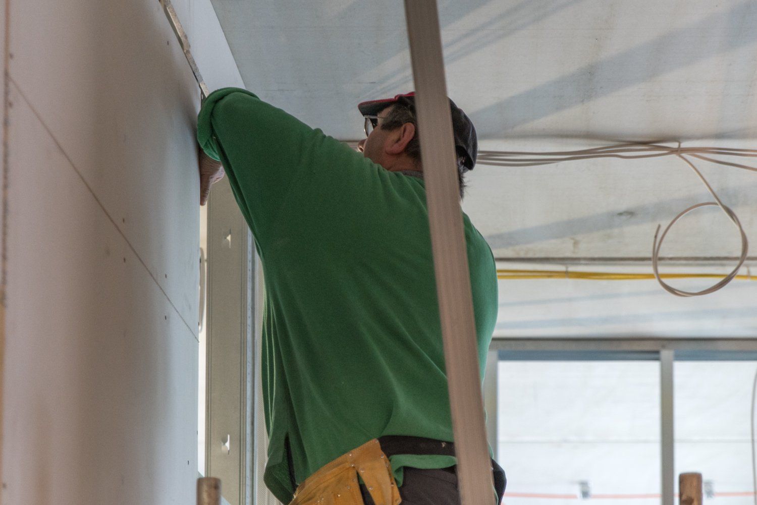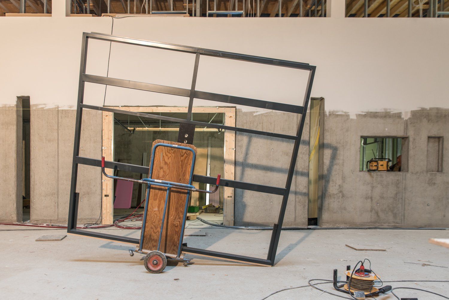 Im Erdgeschoss wurden die neuen Tore der zukünftigen Geräteräume eingesetzt. Sie sind, wie auch die Prallwände, die die Halle umlaufen, federgelagert. Das soll bei einem möglichen Aufprall im Sportbetrieb, dass Verletzungsrisiko der Sportler minimieren.