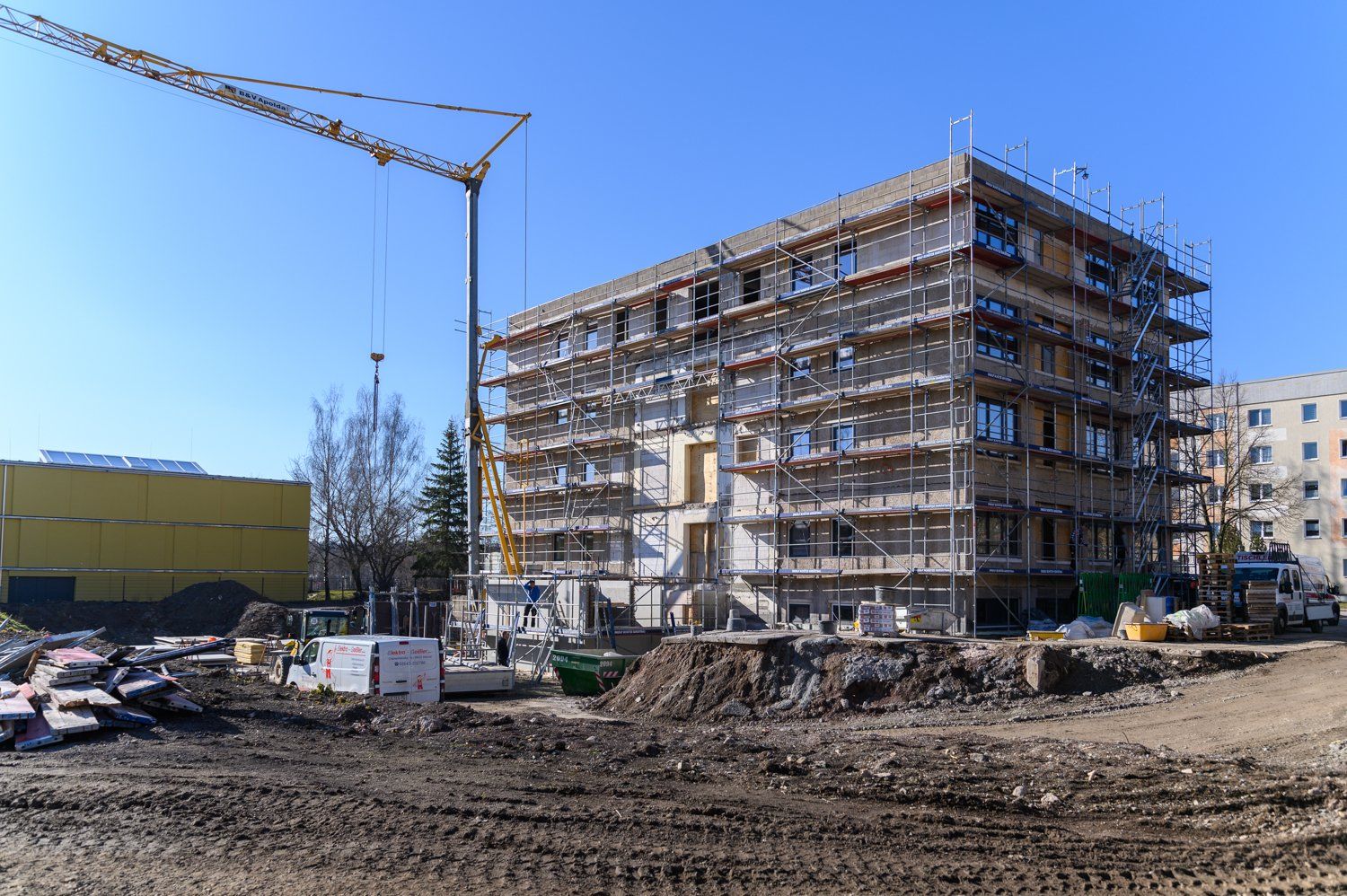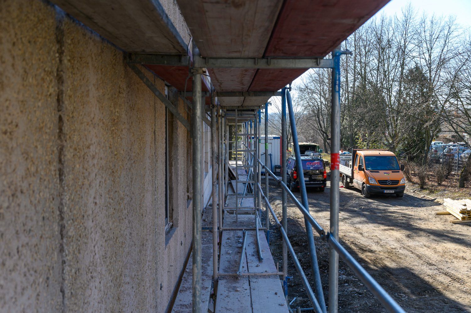 Parallel zu den Baumaßnahmen laufen im Außenbereich die Rohbaumaßnahmen für das zukünftige Treppenhaus samt Aufzug. Diese sollen in den kommenden Wochen beendet werden.